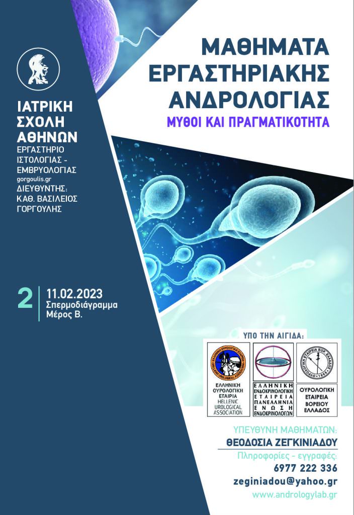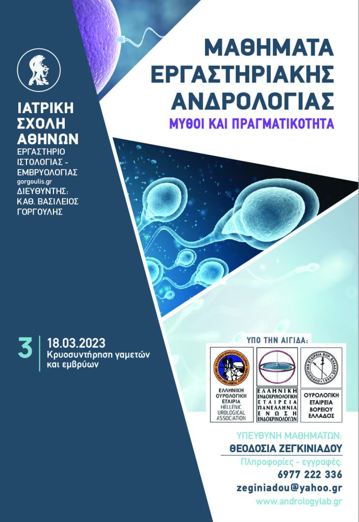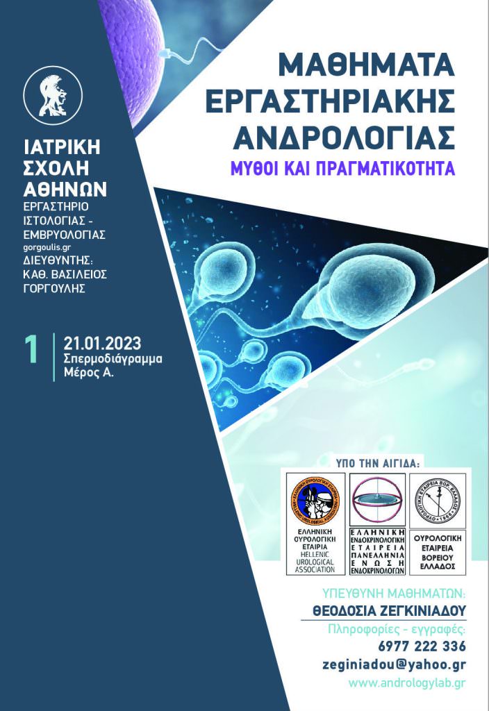Το εργαστήριο Ιστολογίας-Εμβρυολογίας της Ιατρικής Σχολής του Πανεπιστημίου Αθηνών, διοργανώνει για όγδοη χρονιά μαθήματα με θέμα την Εργαστηριακή Ανδρολογία. Τα μαθήματα έχουν θεωρητικό και πρακτικό μέρος, με την μορφή demo, με σκοπό την καλύτερη κατανόηση των εξετάσεων που θα αποτελέσουν αληθινό βοήθημα στην/στον κλινικό γιατρό για την διερεύνηση της γονιμότητας.