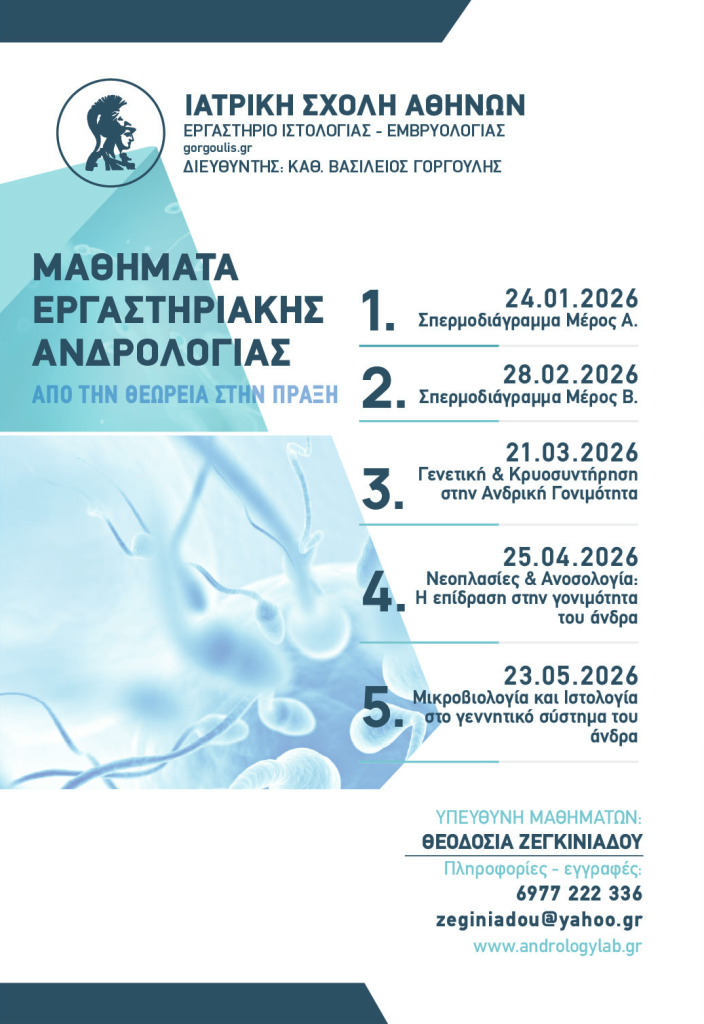 Το εργαστήριο Ιστολογίας-Εμβρυολογίας της Ιατρικής Σχολής του Πανεπιστημίου Αθηνών, διοργανώνει από το 2013 μαθήματα με θέμα την Εργαστηριακή Ανδρολογία. Τα μαθήματα καλύπτουν όλη την γκάμα των εργαστηριακών εξετάσεων που παρέχουν πολύτιμες πληροφορίες στην διερεύνηση της Ανδρικής Γονιμότητας.