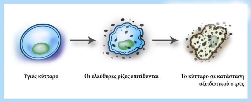 Free radicals (Reactive Oxygen Species, ROS) are substances that have only one electron on their surface. Free radicals are very unstable molecules and in their attempt to acquire a stable structure, “steal” electrons from adjacent substances, which however, are converted into free radicals. This way, a chain reaction begins, that disrupts cellular balance and function.