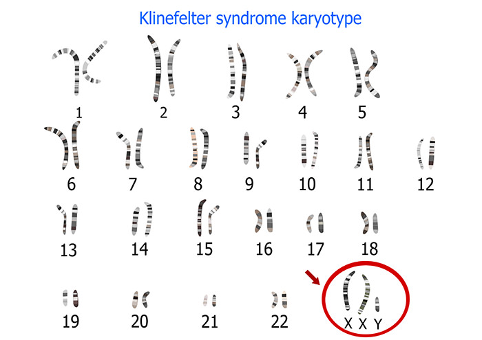 The most common condition due to a change in the number of chromosomes is Klinefelter syndrome. Men with Klinefelter syndrome have an extra X chromosome and instead of 46 XY chromosomes in each cell they have 47 XXY chromosomes. The presence of the extra chromosome is the reason why some men with Klinefelter syndrome do not have normal spermatogenesis and are usually azoospermic.