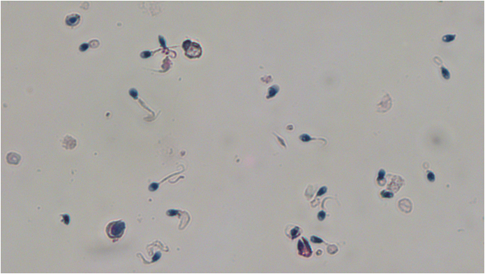 The most common method for the vitality of spermatozoa is the eosin-nigrosin method. This method is based on the use of a dye that cannot cross the cell membrane, when a cell is alive. As a result all spermatozoa that are alive remain white while the dead ones stain red, as shown in the picture.